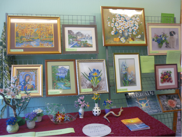 С первых чисел октября действует постоянно обновляемая выставка творческих работ участниц клуба «Зеркало». Сейчас представлены работы Красавиной Екатерины Николаевны и Ильиной Валентины Александровны, выполненные в технике бисероплетения, вышивка и вязание крючком. Приятно созерцать «Хризантемы», вышитые лентами, фантазийные узоры в кружевах, фиалки из бисера.