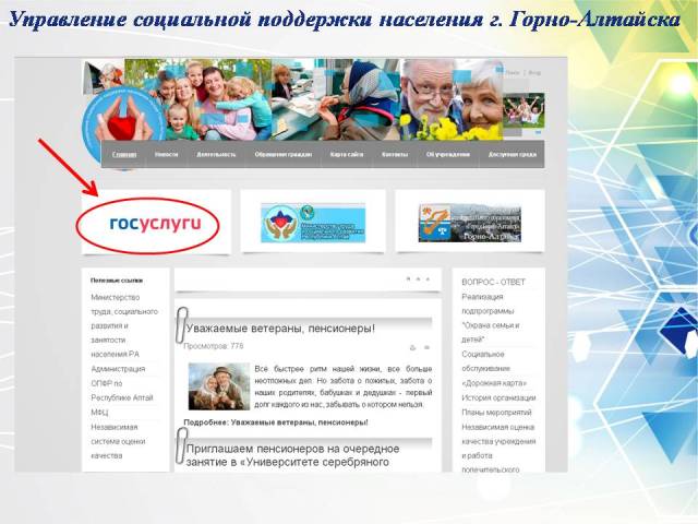 Организаторы мероприятия городское Управление социальной поддержки населения и филиал АУ РА «Многофункциональный центр предоставления государственных и муниципальных услуг» в г. Горно-Алтайске познакомили собравшихся с преимуществами получения услуг в электронном виде и применением их в повседневной жизни. На практике показали возможность получения востребованных услуг, предоставляемых в сфере социальной поддержки в электронном виде. Пожилые люди теперь могут, не выходя из дома, подать заявление о назначении компенсации за топливо, жилищно-коммунальные услуги и субсидии на ЖКУ.