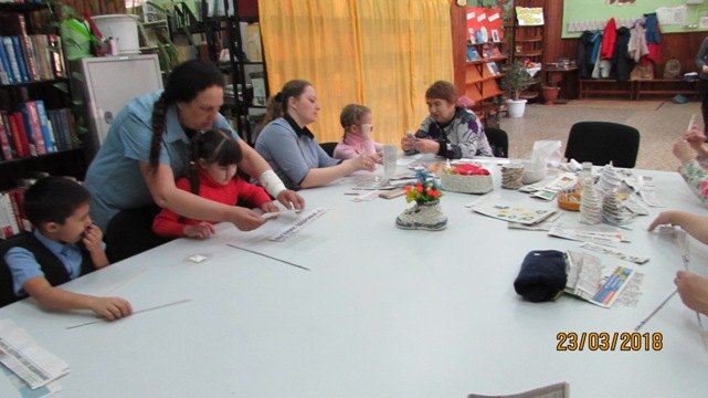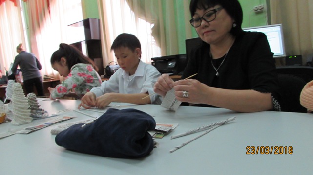 В зале городской библиотеки № 2 был организован мастер-класс по плетению изделий из бумажных трубочек для замещающих семей, на котором присутствовали приемные родители и их дети.