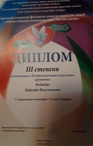 Граждане, состоящие на социальном обслуживании в городском Управлении социальной поддержки населения, постоянно принимают участие в данном мероприятии. В этом году на конкурс представлены работы Надежды Полуэктовны Вайнберг, которая увлекается рисованием и алмазной мозаикой. Глядя на красоту, созданную ее руками, сложно представить, что автор — человек с ограниченными возможностями здоровья. На конкурсе она была отмечена дипломом 3 степени в номинации «Изобразительное искусство» в возрастной категории 55 лет и старше.